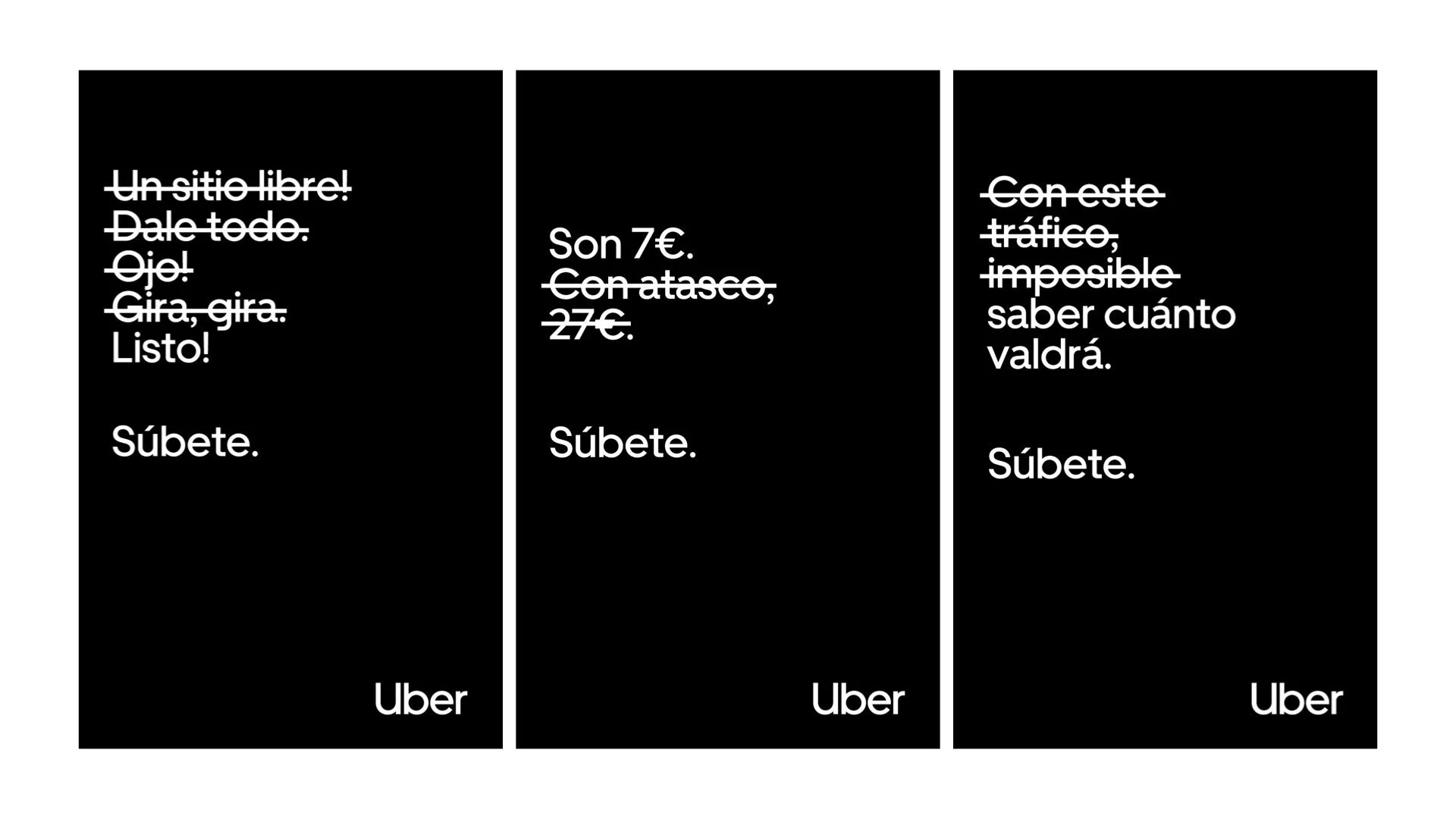 From left to right: 1. A free spot! Go for it! Careful! Turn, turn. Ready! Get on board. Uber | 2. It's 7€. With traffic, 27€. Get on board. Uber | 3. With this traffic, it's impossible to know how much it will cost. Get on board. Uber