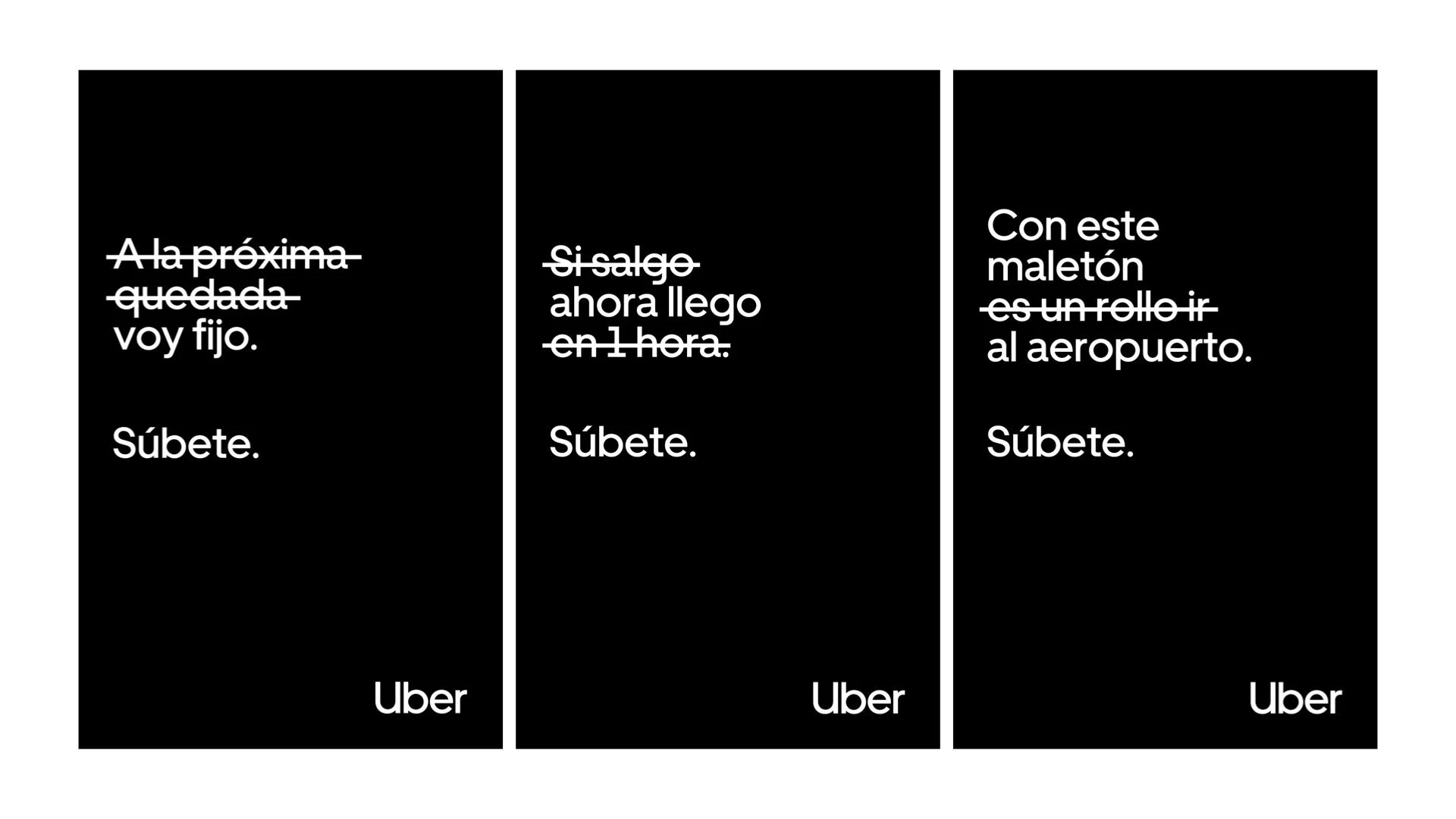 From left to right: 1. I'm definitely going to the next meetup. Get on board. Uber | 2. If I leave now, I'll arrive in 1 hour. Get on board. Uber | 3. With this huge suitcase it's a hassle to go to the airport. Get on board. Uber